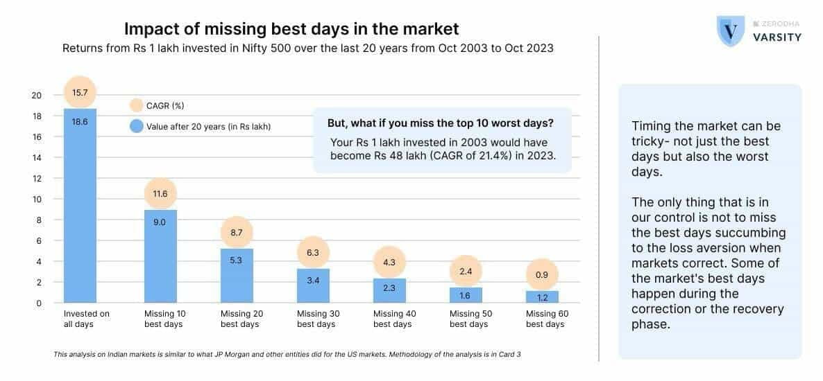 A picture showing the impact on our returns if we miss the best days of the market. Even if we miss just the ten best days, our returns will significantly decrease. However, no one knows which are the best days of the market or when they will come. So, what should we do? We need to stay invested in the market on all days, including the best and worst days. That’s why it is said that we should remain invested through all the ups and downs of the market. Withdrawing investments when the market falls and reinvesting after it starts rising won’t work.
